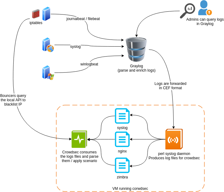 Crowdsec's architecture allows running several agents, each parsing the local logs on the server it's running, and sending events to a local API. While this approach works and is flexible, it might not be the most efficient. In my case, all my servers are already sending their logs to a Graylog instance. Running one crowdsec agent on all of those VM would be a waste :