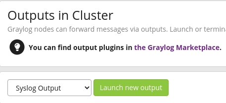 Now in Graylog, you can create a new output. Go in System → Outputs. Select the “Syslog output” and click launch new output