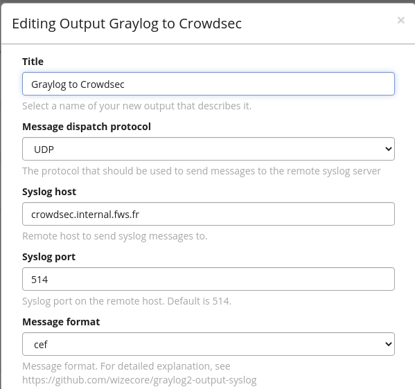 I wrote a small perl daemon, named g2cs (Graylog to Crowdsec). It's available here. It'll simply listen on a UDP port, waiting for messages to consume from Graylog. It assumes the logs are sent using the CEF format (so, this is the format we'll choose later, for Graylog output). Using a structured log format between Graylog and g2cs allows some filtering in g2cs (for example, to recognize nginx log and put them in a dedicated file, separated from the general syslog). This daemon is very simple